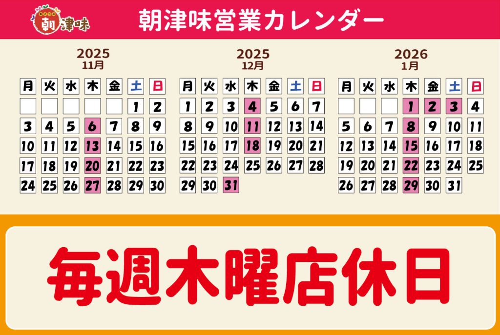 いつも朝津味にご来店いただきありがとうございます。朝津味では毎週木曜日を店休日と...