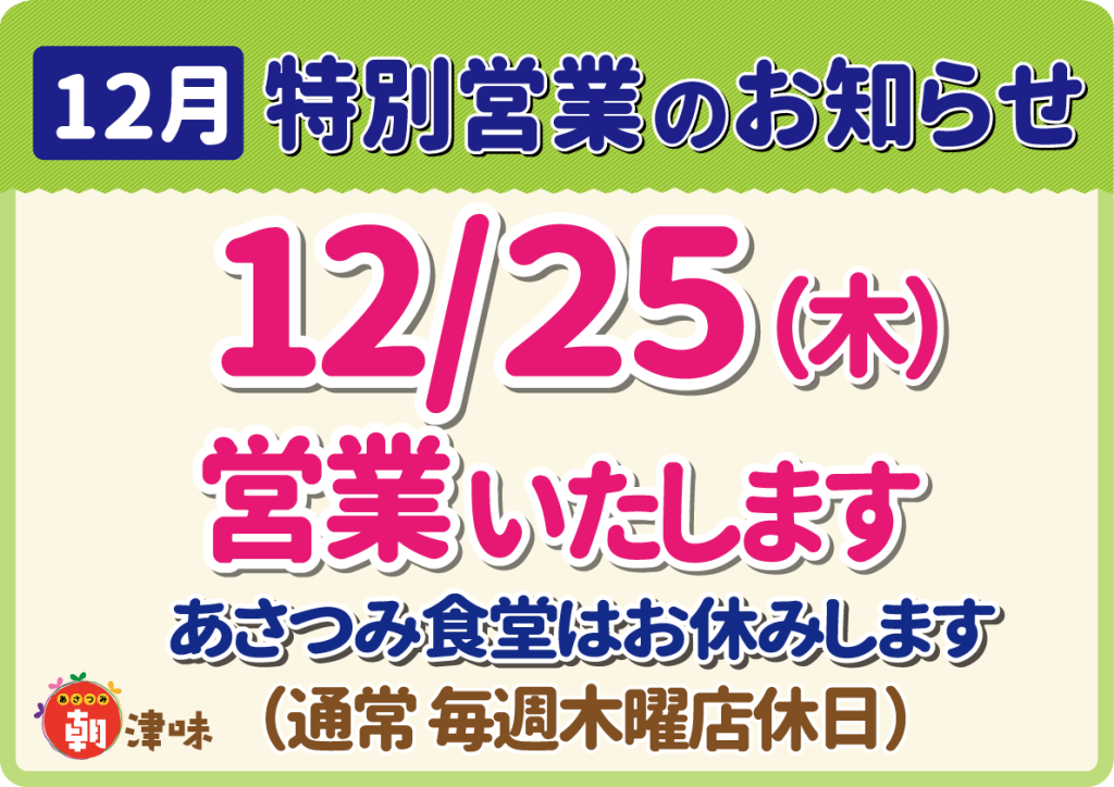 いつも朝津味をご利用いただきありがとうございます。朝津味では2025/12/20...