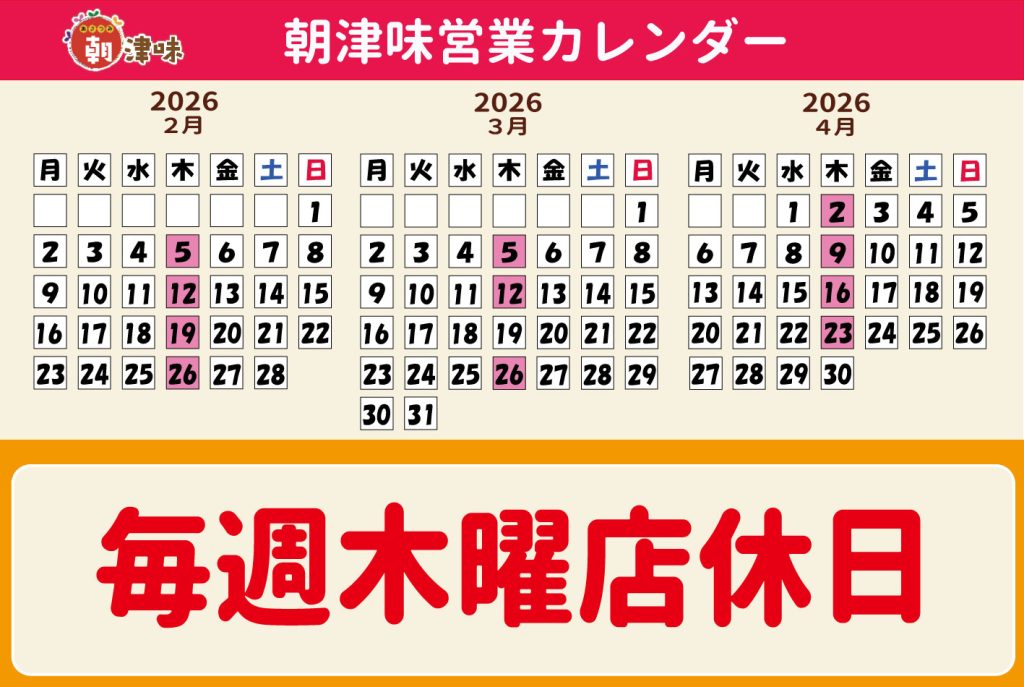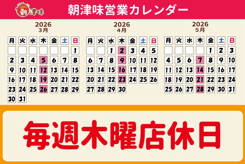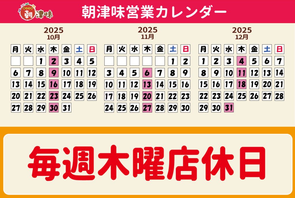 いつも朝津味にご来店いただきありがとうございます。朝津味では毎週木曜日を店休日と...