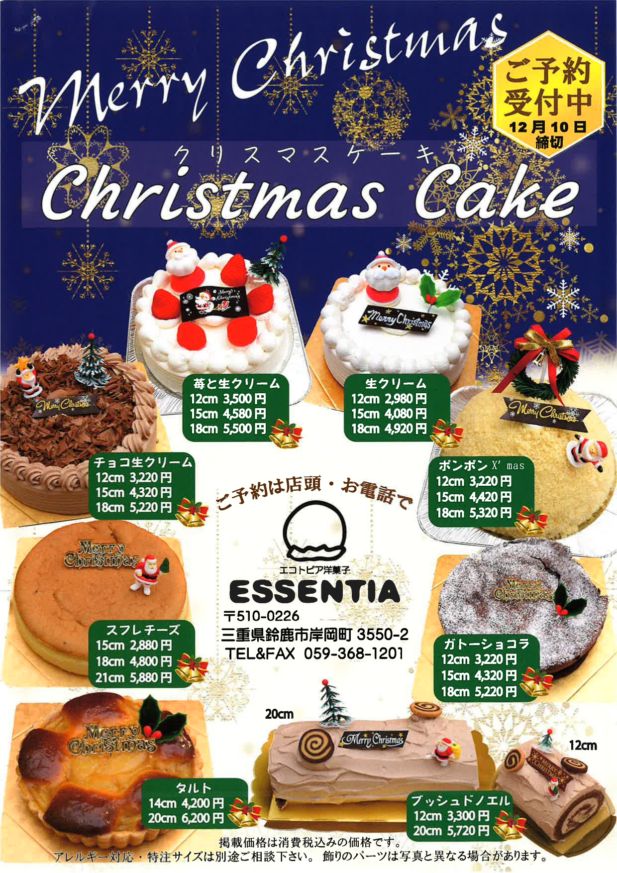 エコトピア洋菓子 エッセンティアさんのクリスマスケーキの予約受付を開始いたしました!みなさまのご予約をお待ちしております。