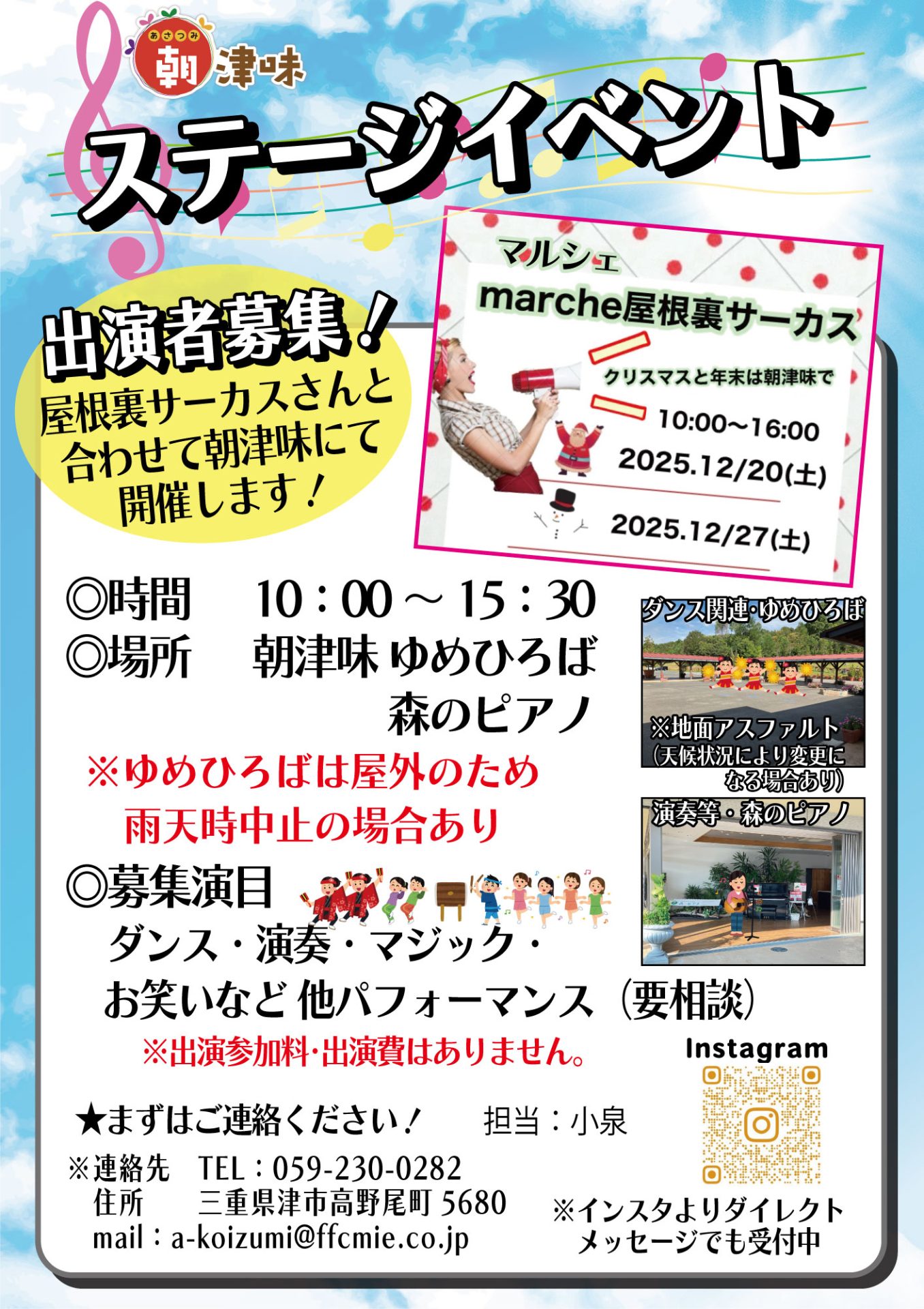 「屋根裏マルシェ」にあわせて、朝津味にてステージイベントの開催を決定!
