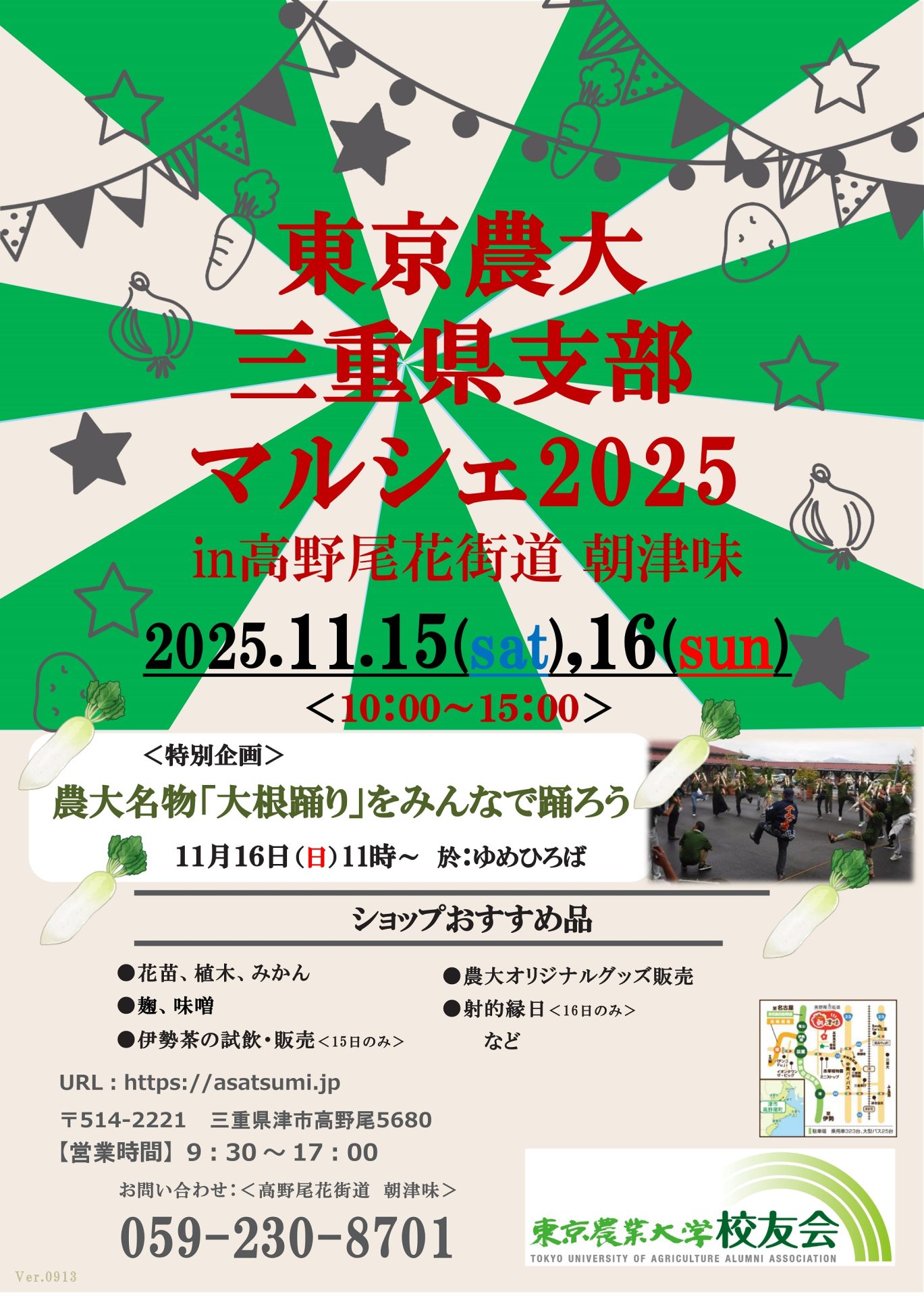 イベント情報 朝津味イベント情報東京農業大学マルシェ 東京農業大学マルシェ 2025/11/15(土)〜2025/11/16(日) 時間:10:00~15:00 場所:ゆめひろば 主催:東京農業大学 校友会 一覧へ戻る