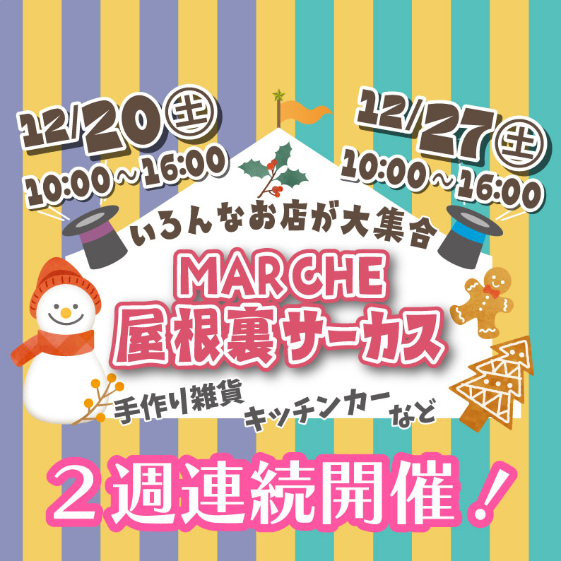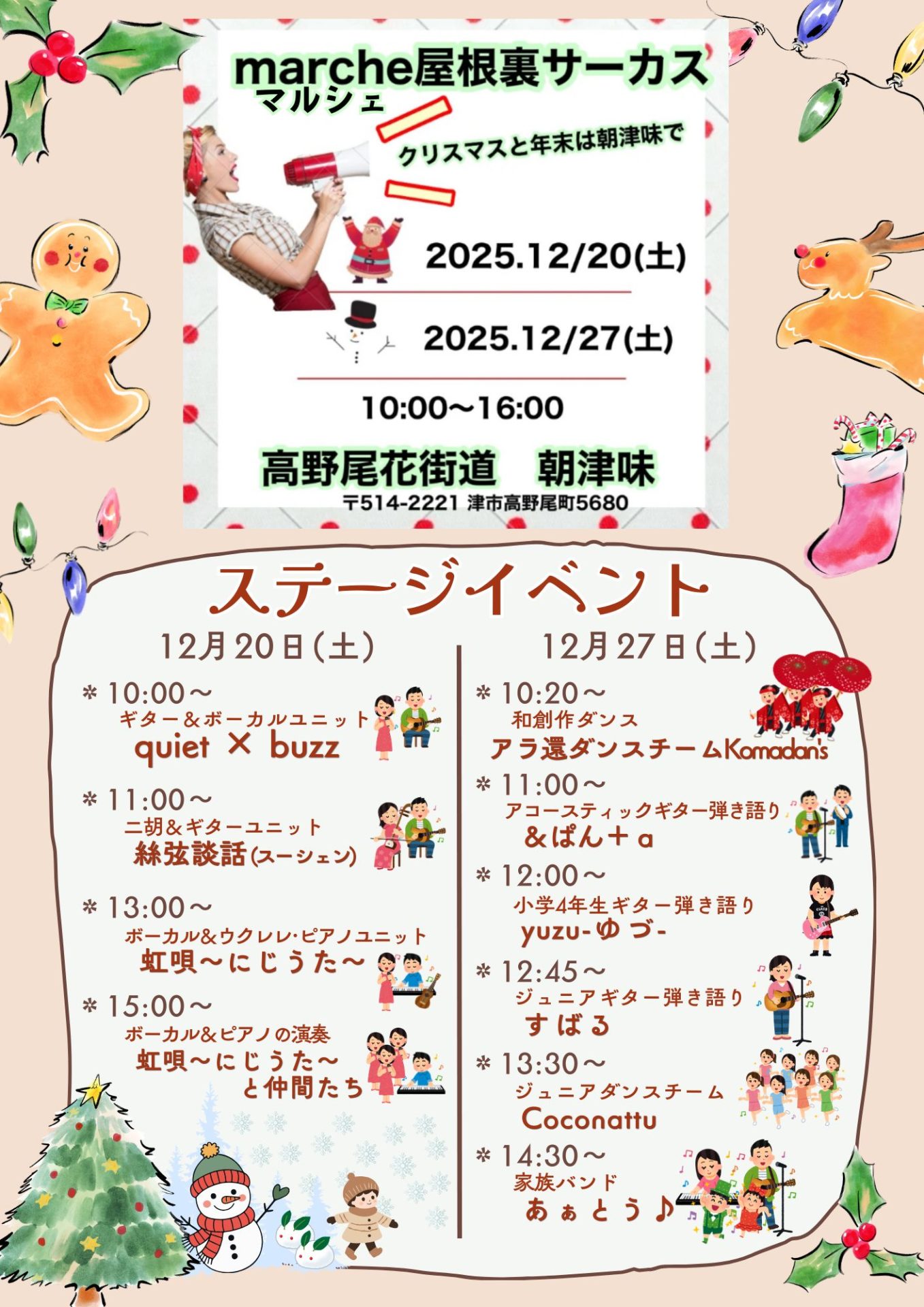 イベント情報 朝津味イベント情報Marche 屋根裏サーカス Marche 屋根裏サーカス 2025/12/20(土) 時間:10:00~16:00 場所:イベント広場 主催:屋根裏サーカス(@yaneura.circus) ハンドメイド雑貨や、キッチンカーの出店あり! いろんなお店が大集合! 大人気のマルシェが朝津味で2週連続開催! ◆同時開催!ステージイベント 出演者リスト↓↓↓ 一覧へ戻る
