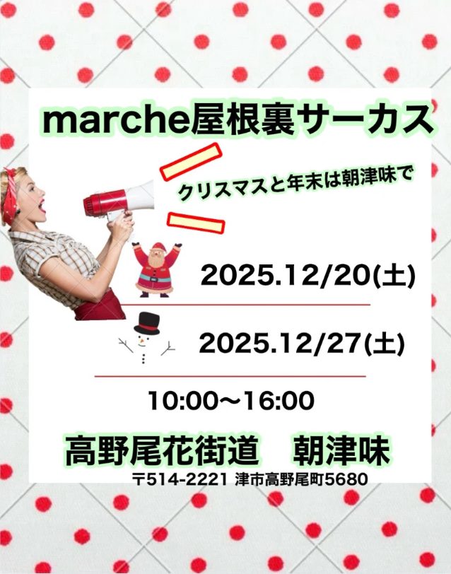 イベント情報 朝津味イベント情報Maruche 屋根裏サーカス Maruche 屋根裏サーカス 2025/12/27(土) 時間:10:00~16:00 場所:イベント広場 主催:屋根裏サーカス(@yaneura.circus) ハンドメイド雑貨や、キッチンカーの出店あり! いろんなお店が大集合! 大人気のマルシェが朝津味で2週連続開催! 一覧へ戻る
