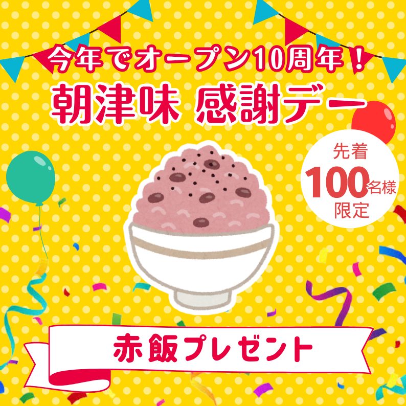 イベント情報 朝津味イベント情報【朝津味感謝デー】赤飯プレゼント 【朝津味感謝デー】赤飯プレゼント 2026/3/8(日) 時間:9:30~ ※なくなり次第終了 場所:ファーマーズマーケット 先着100名様限定(※1グループ1つまで) 朝津味は今年でオープン10周年を迎えます! それを記念して、毎月朝津味感謝デーを開催! 今回は赤飯を先着100名様にプレゼントいたします(※1グループ1つに限ります)。 ぜひご来店ください。 一覧へ戻る